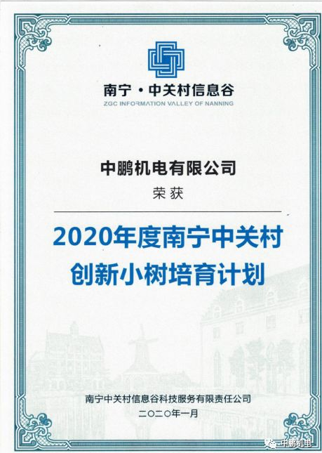 按照“科技中小型企业-高新技术企业-瞪羚企业-上市公司”的创新型企业的阶梯培育体系,把创新小树培育成为参天大树,形成一片产业之林,通过南宁中关村综合评估入驻企业的创新能力、成长能力和经济贡献能力指标,中鹏机电有限公司入选《2020年度南宁中关村“创新小树”培育计划》。