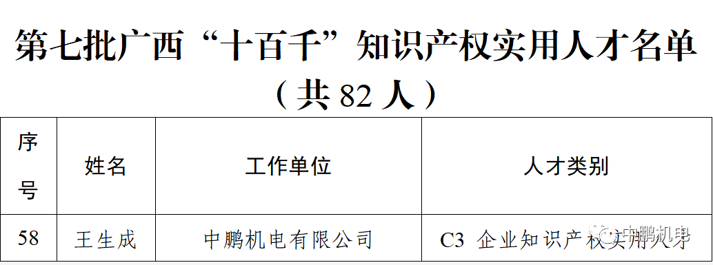 根据《第七批广西“十百千”知识产权人才遴选工作的通知》(桂市监函〔2021〕832号)要求,经公开申报、组织推荐、专家评审,拟确定第七批广西“十百千”知识产权领军人才10名、中青年专家38名、实用人才82名。中鹏机电CEO王生成入选为知识产权实用人才。