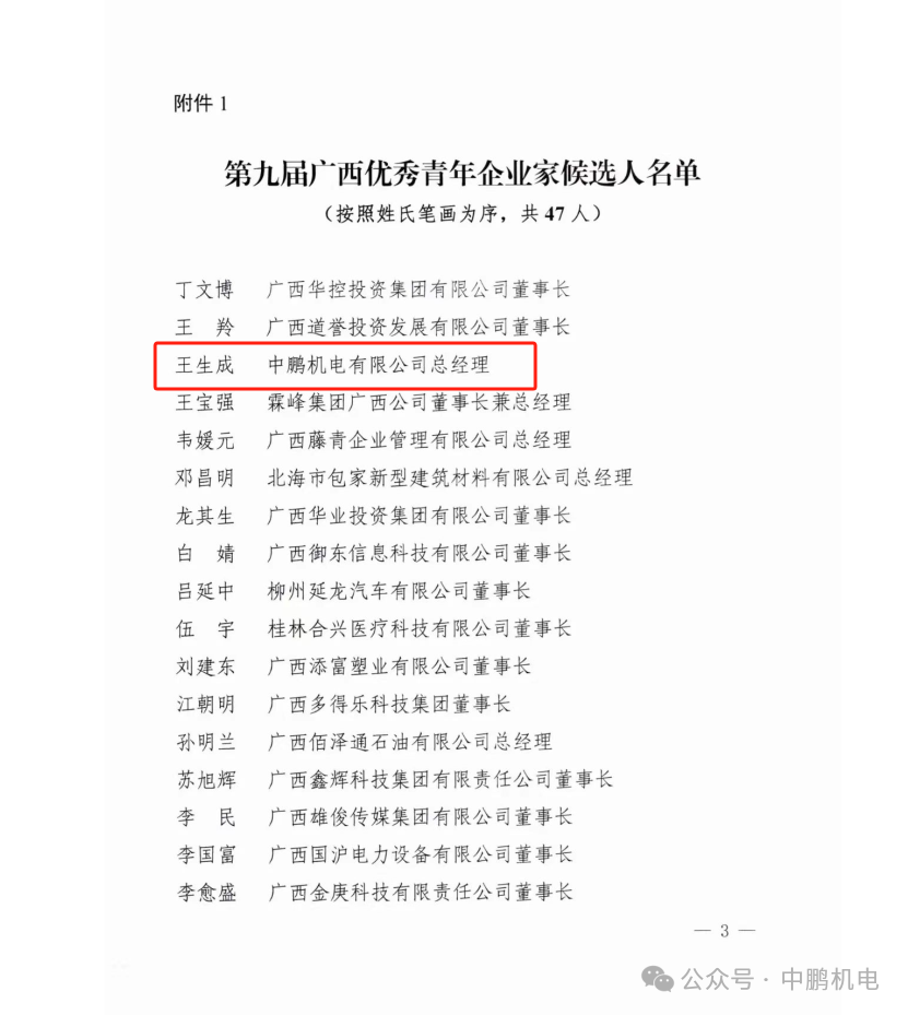 中鹏机电有限公司总经理王生成先生荣获第九届广西优秀青年企业家荣誉称号。这一荣誉不仅是对中鹏机电的认可,更是对其在行业中的卓越表现和杰出贡献的肯定。
